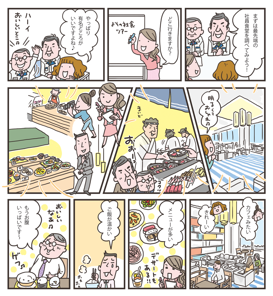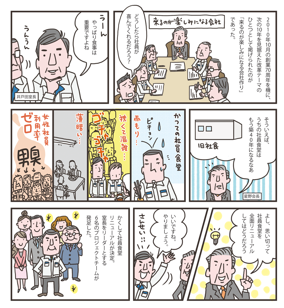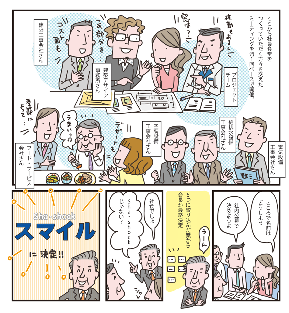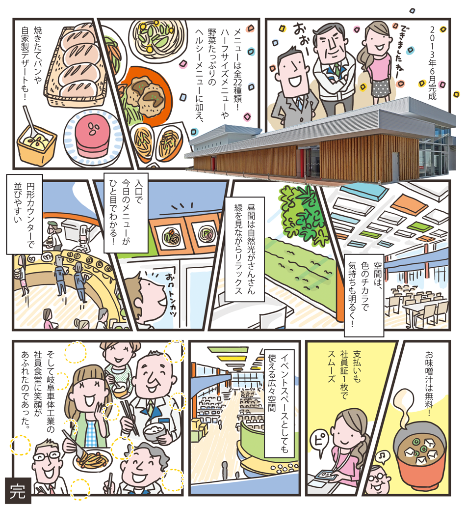 社員食堂工場敷地内に「体と気持ちが元気になる食堂」をテーマにした社員食堂があります。ここでは、野菜をたっぷり盛り込んだ日替わりメニューや地元人気店とのコラボメニュー、ベーカリーなど、多彩なメニューを毎日提供。食を通じて従業員の方々の健康づくりをサポートしています。 -